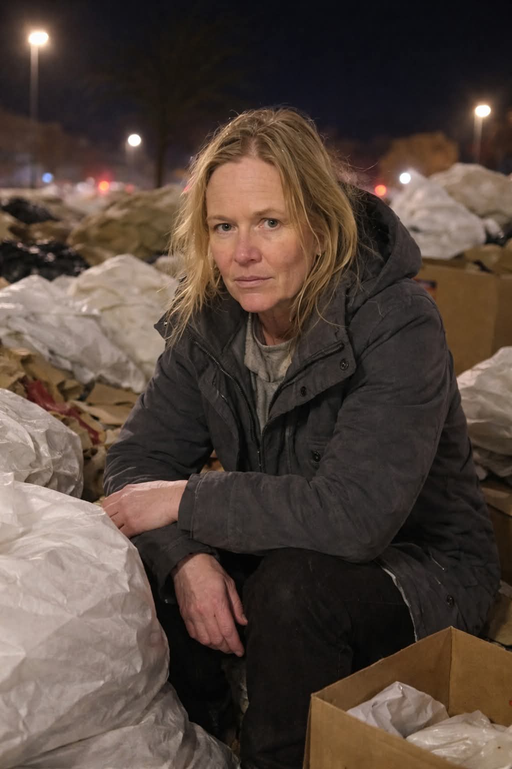 That night, returning from a routine meeting, I noticed a woman digging through discarded bakery boxes in a narrow alley. The streetlights barely touched her, but something about her stance caught my attention — rigid, unbroken, as if dignity was the one thing she refused to lose.
