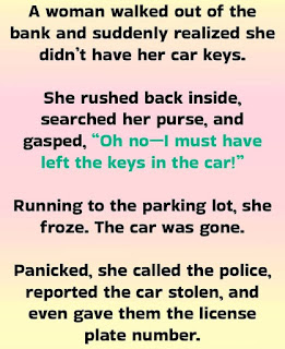She immediately called the police, breathless as she explained everything—how she’d gone into the bank for just a minute, how the keys must’ve been left inside, how her car had disappeared. She rattled off the license plate number like she was taking a final exam.