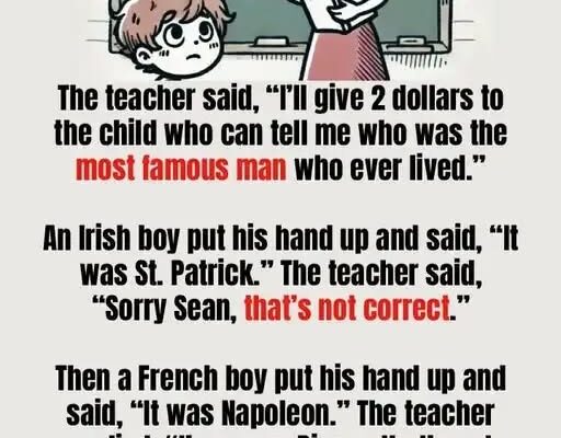 The teacher smiled at the class and announced, “I’ll give two dollars to the child who can tell me who was the most famous man who ever lived.” An Irish boy shot his hand up and confidently said, “It was St. Patrick.” The teacher shook her head. “Sorry, Sean, that’s not correct.” A French boy was next. “Napoleon,” he declared proudly. “I’m sorry, Pierre,” the teacher replied, “that’s not right either.”