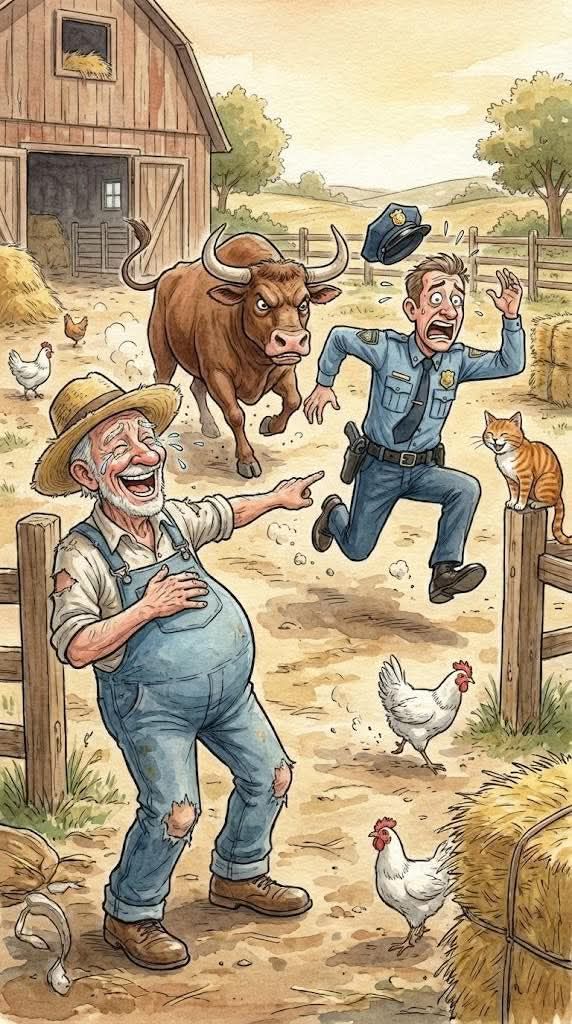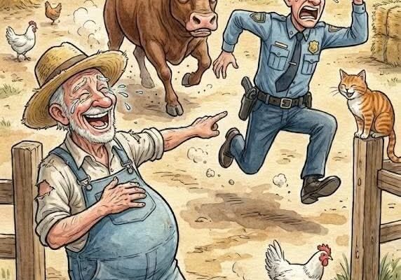 He cupped his hands and called out, voice carrying easily across the yard. “Next time,” he said, “you might want to show your badge to the bull first.”