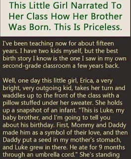 YOU MAY HAVE SEEN THIS BEFORE…BUT STILL GOOD FOR A LAUGH… The ‘Middle Wife’ by an Anonymous 2nd Grade Teacher I’ve been teaching now for about fifteen years. I have two kids myself, but the best birth story I know is the one I saw in my own second grade classroom a few years back. When I was a kid, I loved show-and-tell.. So I always have a few sessions with my students. It helps them get over shyness and usually, show-and-tell is pretty tame. Kids bring in pet turtles, model airplanes, pictures of fish they catch, stuff like that. And I never, ever place any boundaries or limitations on them. If they want to lug it in to school and talk about it, they’re welcome
